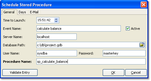 This event can be used to run particular stored procedure on regular basis. In addition to general configuration settings this event has only one more value - the name of the stored procedure.